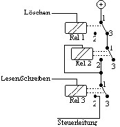 Liegt an der Steuerleitung Spannung an, und man gibt den Befehl „lesen“, so zieht Relais 3 an, Schaltet die Spannung an den Spulenkontakt von Relais 2, dieses zieht ebenfalls an, und schaltet die positive Spannung ebenfalls an den gleichen Spulenkontakt. Läßt man Relais 3 abfallen, so fließt zwar von Kontakt 1 von Relais 3 kein Strom mehr, aber Relais 2 versorgt sich selbst mit Strom, denn die positive Spannung liegt nach wie vor am Spulenkontakt von Relais 2. Die Schaltung befindet sich wiederum in einem stabilen Zustand. Nur ist jetzt eine 1 gespeichert. Will man diese 1 wieder auf die Steuerleitung schreiben, so muß man nur den Befehl „schreiben“ geben, also +5 Volt an die entsprechende Leitung anschließen, und die Zelle schaltet die „gespeicherte 1“ an die Steuerleitung. Gibt man den Befehl „löschen“, so trennt Relais 1 die Stromquelle von Kontakt 1 von Relais 2, Relais 2 fällt ab. Wenn dann wieder Spannung am Kontakt 1 von Relais 2 anliegt, bleibt Relais 2 aus. Die Speicherzelle ist wieder in ihrem