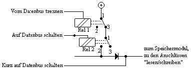 Dies reicht zum Datentransfer später allerdings nicht aus, denn es kann immer nur ein Befehl gleichzeitig über den Befehlsbus wandern. Nehmen wir an, wir haben eine 11 Bit Binärzahl in einer Speicherzelle abgespeichert. Um sie in einer andere (gelöschte) Speicherzelle zu übertragen, muß zuerst die erste Speicherzelle mittels Datenschalter auf den Datenbus geschaltet werden. Dann muß die zweite Speicherzelle kurz auf den Datenbus geschaltet und gleich wieder davon getrennt werden(denn sie hat den Binärwert gleich angenommen). Nun muß die erste Speicherzelle abgetrennt werden. Es fällt auf, daß das dauerhafte Schalten auf den Datenbus, und das „wegnehmen“ ebenfalls durch kurze Befehle verfügbar gemacht werden muß. Dies ist recht leicht mit folgender Schaltung machbar: